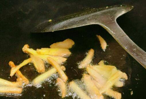 葱姜切丝,油烧热放姜丝炒至微黄,放葱丝略炒。