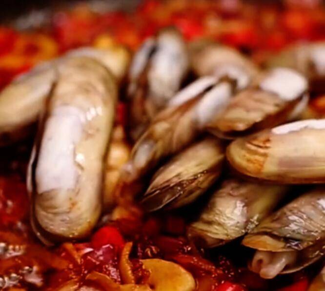2、接着放入郫县豆瓣酱,美人椒,蛏子。