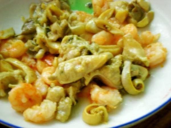 7、再放入炒好的虾仁和河蚌肉一起翻炒1分钟,调入盐、味精等调料即可出锅。