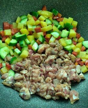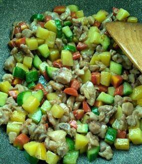 锅热放油将胡萝卜、土豆先炒一会再加入黄瓜,混合爆炒后加入鸡腿肉和盐一起炒。