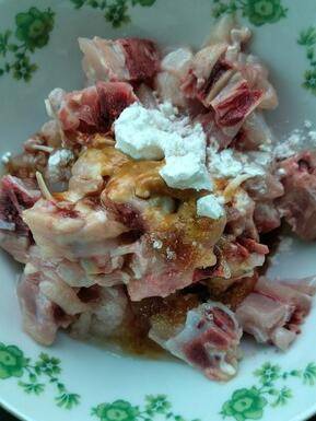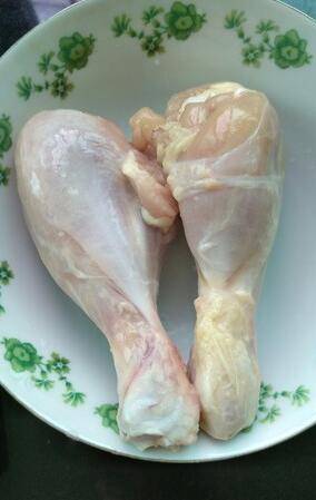准备食材:鸡腿、土豆、黄瓜、盐、玉米淀粉、料酒、白糖、酱油、蚝油。