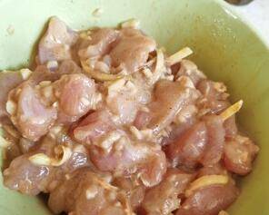 2、鸡腿肉切小块洗净,加入蒜粒、姜、生抽、盐、十三香、生粉均匀搅拌,腌制15分钟。