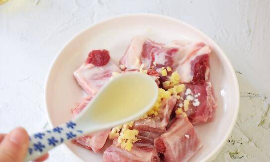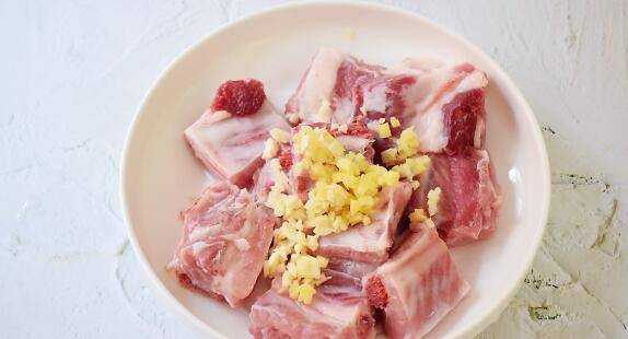2、把姜蒜末放入排骨中。