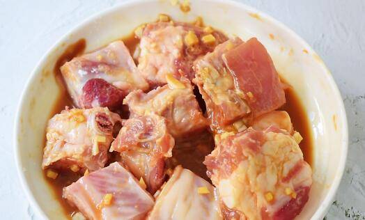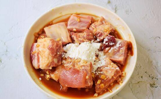 6、从冰箱取出腌制好的排骨,加入1汤匙食用油和1汤匙淀粉拌匀。