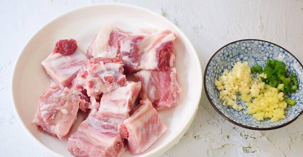 1、排骨斩成小块加入1汤匙淀粉,用手抓一小会,然后用清水冲洗干净控干水分备用,这个方法比较容易去掉排骨的血水,蒜切末,姜切末,葱切葱花备用。