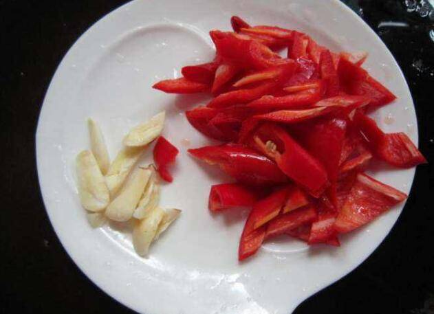 3、胡萝卜 青红椒去籽切小丁,大蒜切片。