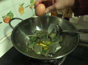 鸡蛋磕一个小口,将蛋液均匀撒入锅内皮扎上,撒盐,翻炒均匀至鸡蛋金黄即可,全程约8分钟左右。