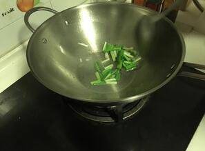 锅烧热,放油,油热后放入蒜苗,煸出香味。