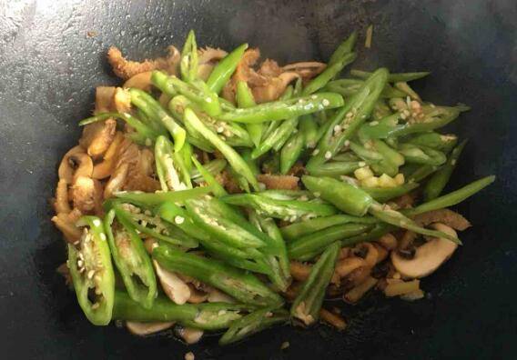 6、炒至辣椒断生后,从锅边淋入少许热水,调入盐、鸡精,翻炒均匀即可出锅。