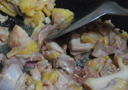 放入姜片爆香,倒入鸡块快速翻炒均匀,倒入料酒翻炒至冒酒香,鸡块慢慢煸出油。
