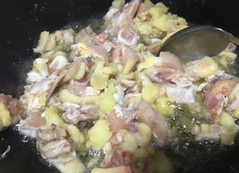 倒入鸡肉,慢炸;