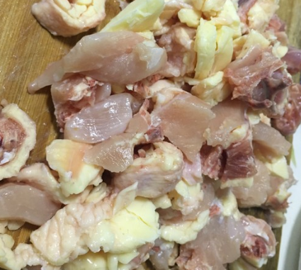准备鸡肉,剁块、一碗干辣椒、花椒粒。