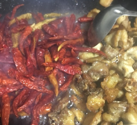 倒入花椒、干辣椒;