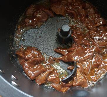 倒入腌制后的猪肝盖锅爆炒1分钟,开锅倒入青椒继续爆炒直至程序结束,出锅。