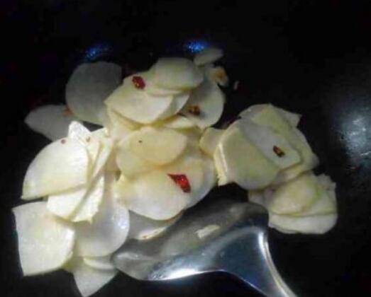 准备食材:红薯200g、食盐适量、调和油适量、红尖椒适量。地瓜剥去皮洗净切薄片;热锅温油放入干红辣椒爆香;倒入地瓜片大火翻炒;加入适量盐炒至地瓜变色即成。