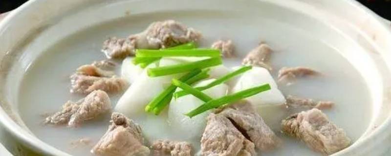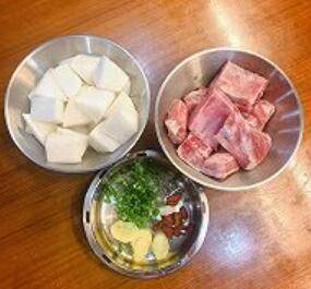 4、将冲洗干净的肋排、白萝卜、姜片一起放入汤锅里,加入高过食材的清水(略多一点),大火烧开后转小火炖煮1个小时。