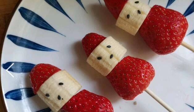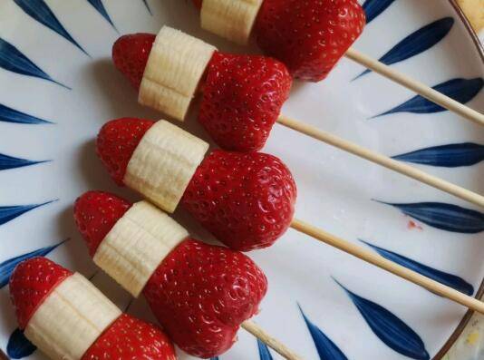 香蕉切段,取一个竹签插入一块草莓,再插入一个香蕉,草莓的头部插上。