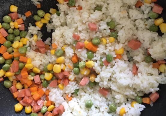 锅中再加一点点油,倒入火腿丁炒出香味,再倒入蔬菜丁翻炒均匀,加入米饭炒散。