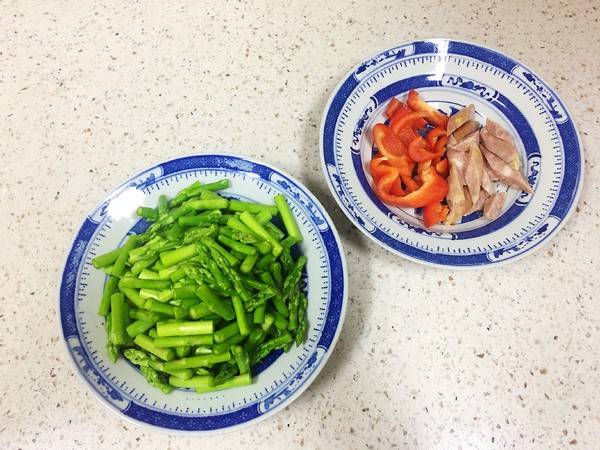 1、芦笋洗净切段;香肠切细段;红甜椒去籽切细条。