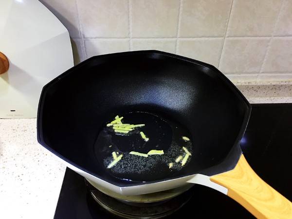 2、锅烧热倒入油,放入姜丝爆香。