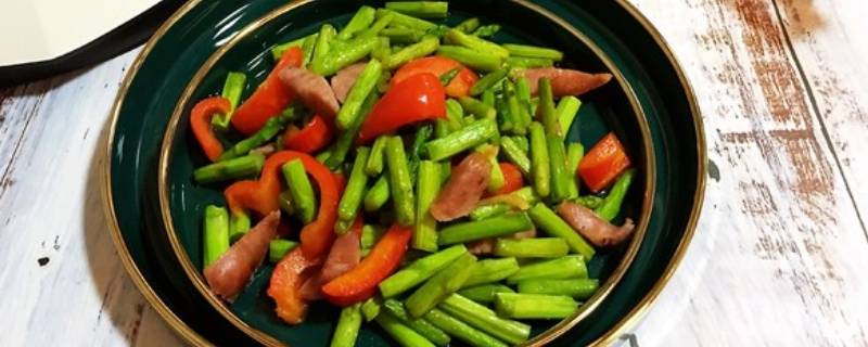 最佳答案主料:香肠1根;辅料:芦笋200克,红甜椒半个,油10毫升,盐2克,生抽5毫升,姜2片。1、芦笋洗净切段;香肠切细段;红甜椒去籽切细条。2、锅烧热倒入油,放入姜丝爆香。3、倒入芦笋段翻炒均匀,放入香肠段、甜椒段翻炒。4、倒入生抽和盐调味,翻炒均匀即可出锅。