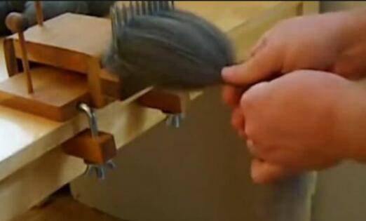 针梳。将净毛梳成条状的羊毛条,梳毛机将毛中的草杂再梳下来一些,将洗净毛梳理成网状。