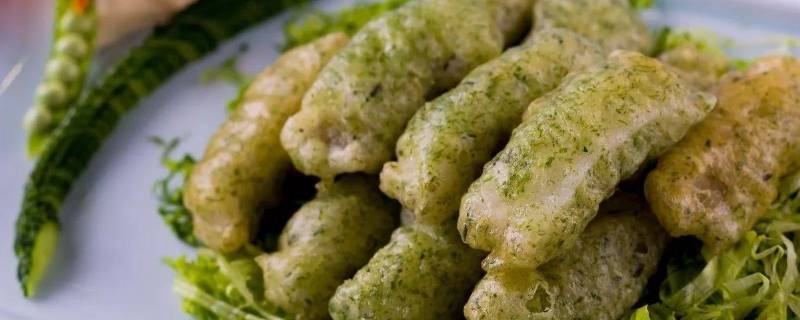 2、苔菜拖黄鱼:需选取新鲜黄鱼洗净,斩头、去尾剔骨,取肉待用;用精制面粉和本地产的苔菜粉作料,调成糊状,将鱼肉挂糊,炸成金黄色楷杷状即可上盘。 黄鱼和苔菜都是本地特产,风味独特。此菜具有软糯鲜嫩,且有苔菜的清香味,食时蘸醋更佳。
