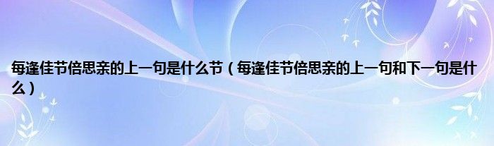 大家好,小科来为大家解答以上问题。每逢佳节倍思亲的上一句是什么节,每逢佳节倍思亲的上一句和下一句是什么很多人还不知道,现在让我们一起来看看吧!