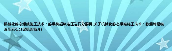 大家好,机械化静态爆破施工技术:静爆牌超级液压岩石分裂机,关于机械化静态爆破施工技术:静爆牌超级液压岩石分裂机的简介很多人还不知道,现在让我们一起来看看吧!